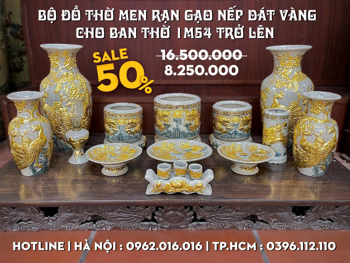 [Sale 50%] Bộ đồ thờ men Rạn Gạo Nếp Dát Vàng cho ban 1m54 trở lên